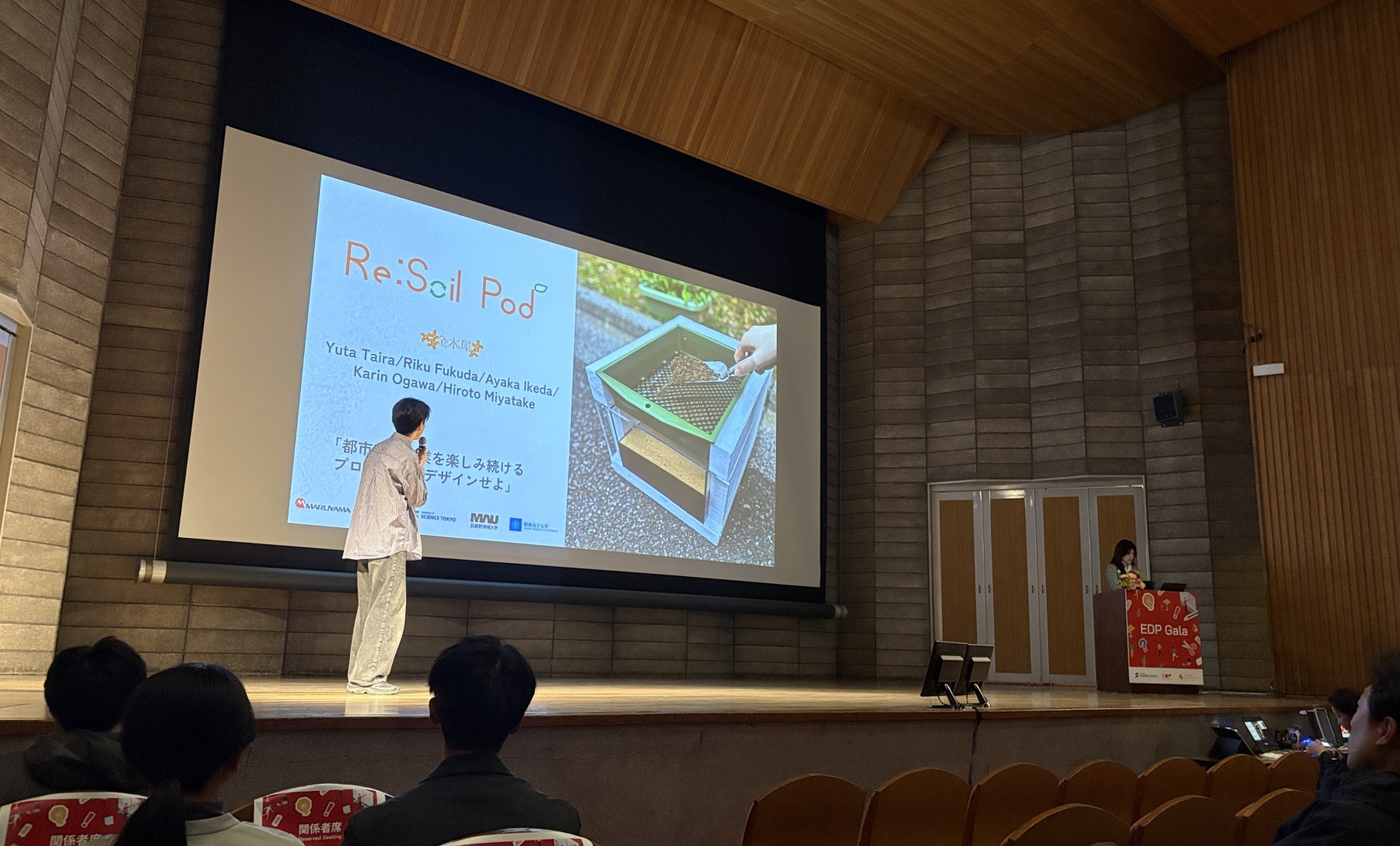 池田彩華さん(デザインプロデュースコース)は、「都市部で農業を楽しみ続けるプロダクトをデザインせよ」(株式会社丸山製作所)という課題に取り組みました。自宅のベランダで痩せてしまった土を蘇らせる「Re: Soil Pod」を提案しました。