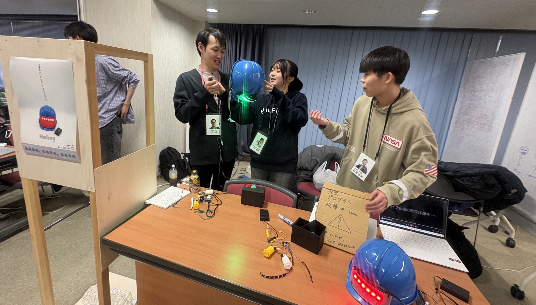 下村絵舞さん(デザインプロデュースコース)が取り組んだ課題は、「少ない人員でも音楽ライブイベントの良質な運営を可能にするためのプロダクトをデザインせよ」(株式会社SI&C)でした。アルバイトが多く働くライブイベント会場にて、仕事の指示がわからないことを光で知らせるヘルメット「Helmo」を提案しました。