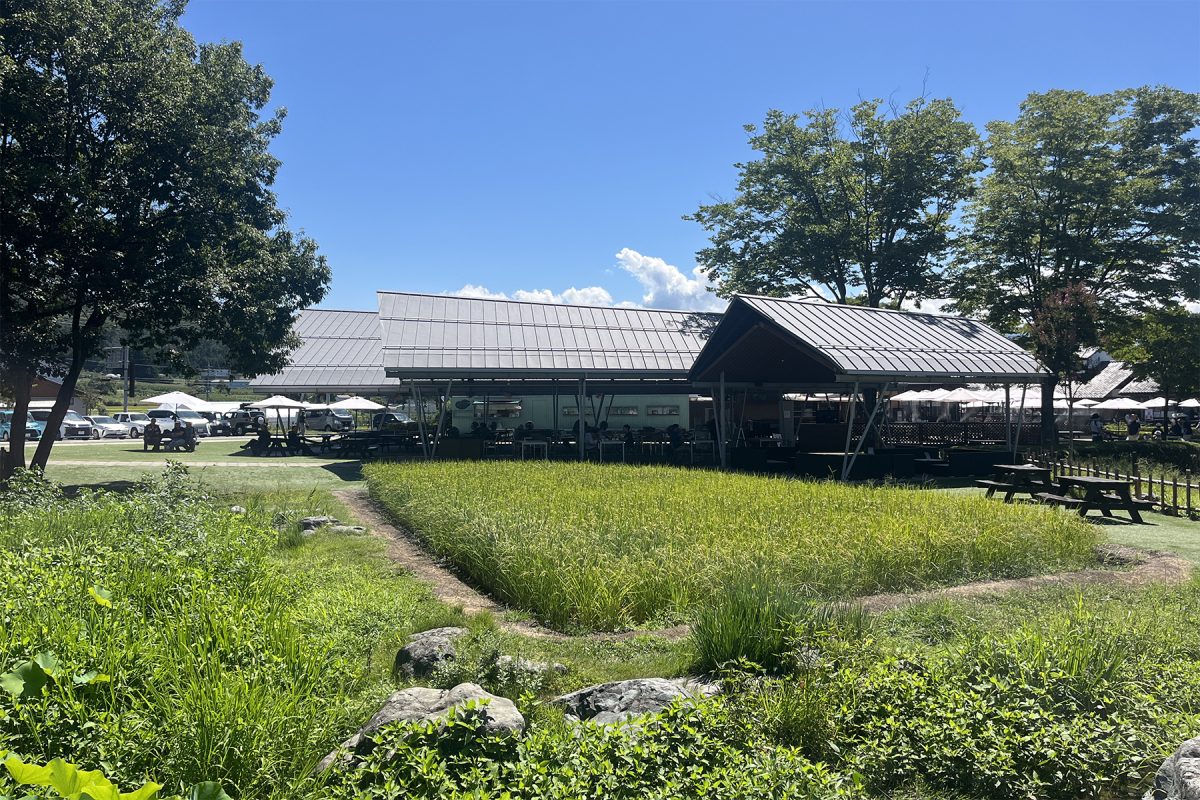 田園プラザ川場では、宮崎浩氏設計の川場ルーフの下で、昼のひと時を過ごしました。