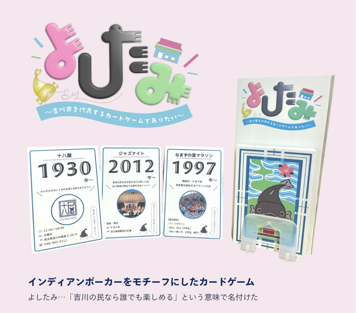 本企画は、デザインプロデュースコース3年⽣前期の授業「デザイン企画演習Ⅱ1」において、「地域の応援団になる」という課題に取り組んだものです。私たちは埼⽟県吉川市を対象に、 “吉川市に住む⼈々が、⾃分たちのまちの魅⼒を再発⾒できるように”を目標に、インディアンポーカーをモチーフにしたカードゲーム「よしたみ」を企画・制作しました。