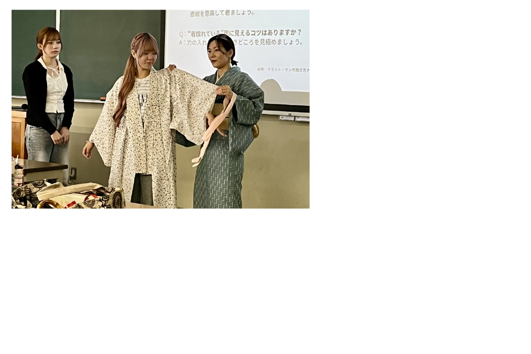 このデザインは担当授業での和服への理解が元になっています。私は本学で「装いの文化」という科目を受け持っていますが、授業では広くアジアから日本の衣服文化までを実際の着装体験を交えたプログラムで実施しています。和服文化のパートで例年、着付けの先生を招き実演を行っています。その授業の中で和服には「おはしょり」という身長に合わせ美しく着こなすサイズ調節の機能があったり、「繰り回し」という着古した着物を解いて羽織や帯として仕立て直し新たに再生する、という素晴らしい考え方があることを着付けをご担当いただいた松田千穂先生より履修学生へご説明いただきました。1着の衣服をサイジングする「おはしょり」と、新しいものを作るのではなく古いものを再活用する「繰り回し」という和服の考え方は日本的であり面白く、大会のビジョンとも通じるものがあるため、この開閉会式で両用する衣裳デザインの着想元となっています。 *写真は2025年度授業での着付けの様子