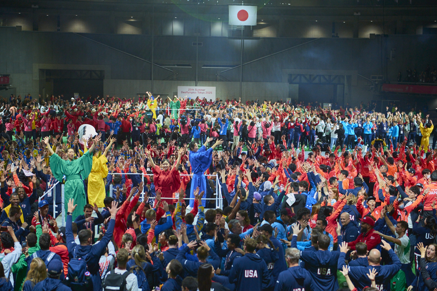 聴覚障害の方にも伝わるようにと重低音の効いた祭囃子の爆音に合わせ、東京体育館フロアの選手団と客席の観客が一体となって「ボンミライ!」を踊り、楽しく盛り上がった大会のフィナーレとなりました。