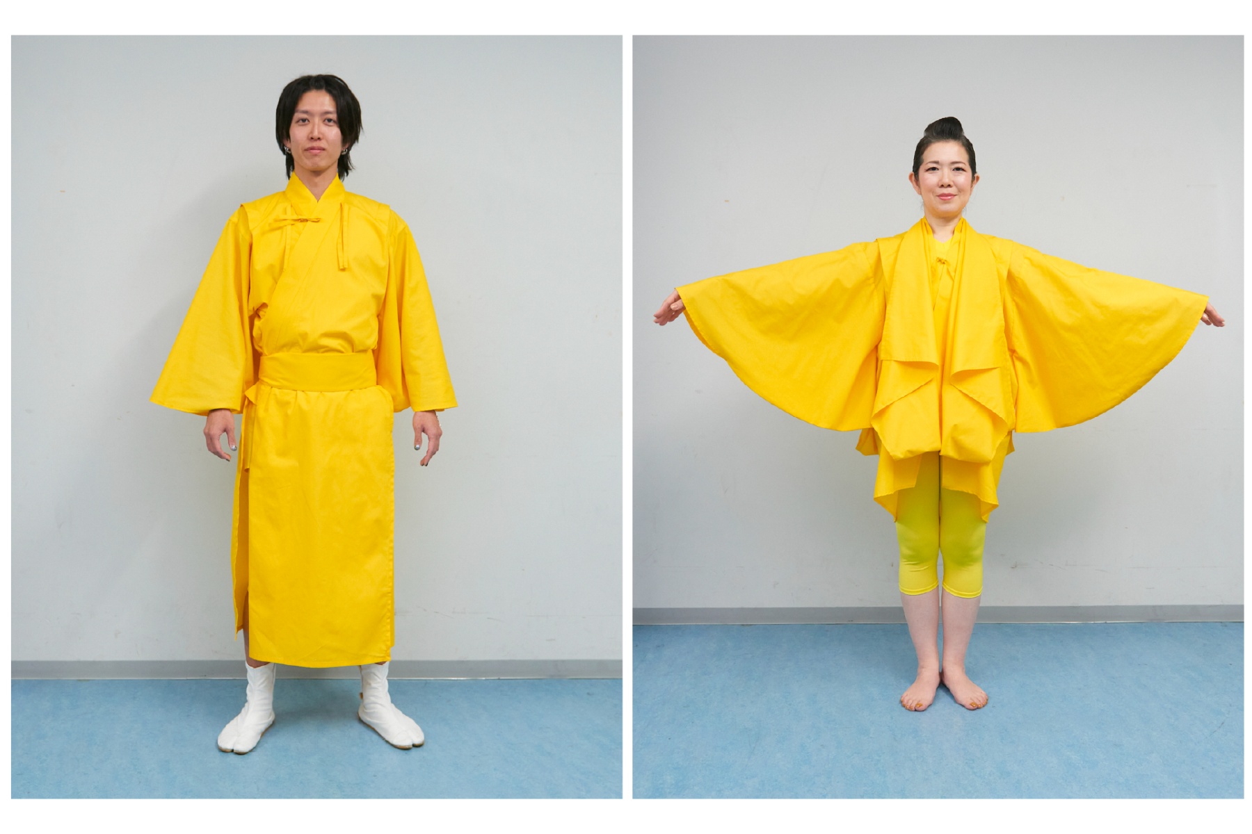 衣裳にはいくつかのループやヒモがついていて、それらを結んだり解くことで1着の衣裳が2つのスタイル(浴衣と羽織)に変化します。
